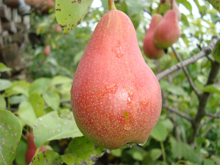 Плоды выше средней величины (масса 170 г), удлиненно-грушевидной, бутылочной формы, у вершины иногда скошенные. Кожица гладкая, блестящая, маслянистая, светло-желтая с ярким красно-карминовым румянцем на солнечной стороне на большей половине плода. Подкожных точек много, мелкие, на неокрашенной части плода зеленые, на освещенной стороне белые, хорошо заметные. Плодоножка средней длины и толщины, слегка изогнутая. Воронка очень мелкая, у некоторых плодов совсем отсутствует. Блюдце узкое, гладкое, глубокое; чашечка открытая. Сердечко среднее, эллиптическое, камеры закрытые, небольшие.